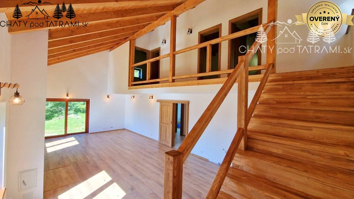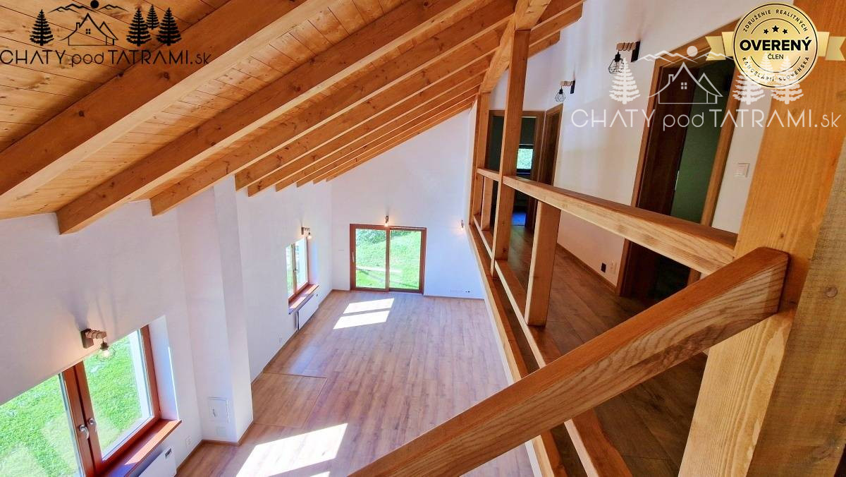 Na prízemí sa nachádza priestranná vstupná chodba, technická miestnosť so svojím vchodom, toaleta a krásna slnečná obývacia izba spojená s kuchyňou otvorená až po strechu chaty. V podkroví sú tri samostatné priestranné izby prístupné z galérie a kúpeľňa s toaletou.