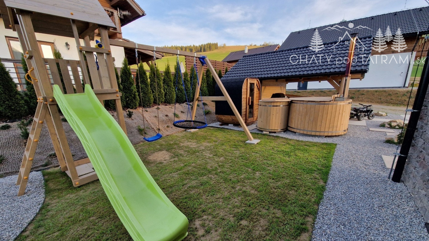 Na pekne upravenom pozemku sa nachádza altánok o rozmeroch 4x5m s uzamykateľným odkladacím priestorom, exteriérová elektrická fínska sauna, ochladzovacia kaďa s možnosťou napúšťania aj v zime cez vonkajší nezamŕzajúci ventil, kúpacia kaďa na tuhé palivo, detské ihrisko, posedenie s ohniskom a parkovisko pre päť áut s 11kW nabíjačkou pre EV.